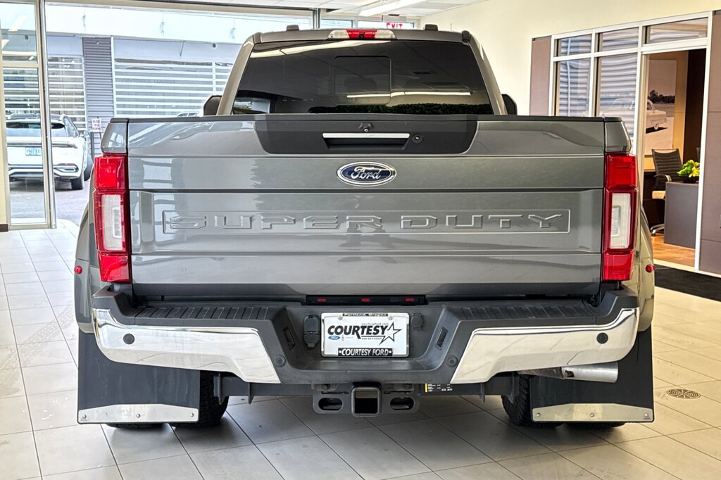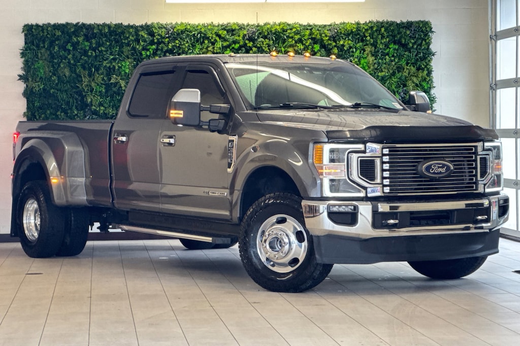 Certified. Gray 2021 Ford F-350SD Lariat DRW DRW 4WD 10-Speed Automatic Power Stroke 6.7L V8 DI 32V OHV Turbodiesel NAVIGATION PACKAGE, Ford Factory Certified!!, SUNROOF, F-350 SuperDuty Lariat DRW, 4D Crew Cab, Power Stroke 6.7L V8 DI 32V OHV Turbodiesel, 10-Speed Automatic, 4WD, Gray, Black / Dark Marsala, 10 Speakers, 110V/400W Outlet, 17" Forged Polished Aluminum Wheels, 200 Amp Alternator, 6" Angular Chrome Step Bars, 8-Way Power Driver's Seat, Adaptive Cruise Control & Collision Warning, Air Conditioning, Ambient Lighting - Fixed Color, BLIS Blind Spot Information System, Body-Color Door Handles w/Chrome Insert, Brake assist, Chrome Exhaust Tip, Chrome Package, Delay-off headlights, Dual rear wheels, Easy Entry®/Exit Memory Driver's Seat Feature, Electronic Stability Control, Emergency communication system: SYNC 3 911 Assist, Engine Block Heater, Exterior Parking Camera Rear, Front Bucket Seats, Fully automatic headlights, FX4 Off-Road Package, GVWR: 14,000 lb Payload Package, Heated front seats, Hill Descent Control, Intelligent Access w/Push-Button Start, Lariat Ultimate Package, LED Box Lighting, Limited Slip w/4.10 Axle Ratio, Memory Power-Adjustable Pedals, Memory seat, Off-Road Specifically Tuned Shock Absorbers, Order Code 628A, Pedal memory, Power driver seat, Power Front & Rear Seat Windows, Power Heated/Ventilated Driver Seat w/Memory, Power Heated/Ventilated Passenger Seat, Power passenger seat, Power Telescoping/Tilt Steering Wheel/Column, Power windows, Power-Adjustable Pedals, PowerScope Trailer Tow Mirrors w/Heat, PowerScope Trailer Tow Mirrors w/Memory, Radio: B&O System by Bang & Olufsen, Rear Parking Sensors, Rear step bumper, Rear View Camera & Prep Kit, Remote Keyless Entry, Remote Start System, Remote Tailgate Release, Reverse Sensing System, SiriusXM Radio, Split folding rear seat, Steering wheel memory, Steering wheel mounted A/C controls, Steering wheel mounted audio controls, Steering Wheel-Mounted Cruise Control, SYNC 3 Communications & Entertainment System, Tailgate Step & Handle, Telescoping steering wheel, Tilt steering wheel, Twin Panel Power Moonroof, Unique Chrome Mirror Caps, Unique FX4 Off-Road Box Decal, Variably intermittent wipers, Voice-Activated Navigation.